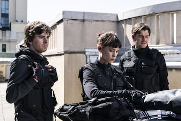 Freddie Highmore, conocido en España por su interpretación en Charlie y la fábrica de chocolate, Bates Motel y The Good Doctor, es el actor principal y uno de los productores de la cinta. El joven talento inglés vuelve a repetir el papel de genio introvertido capaz de resolver cualquier problema que se le plantea. Es un personaje hecho a su medida y su peso en la cinta eclipsa, aunque no estoy seguro de que esto sea para bien, al del resto de compañeros. El veterano Liam Cunningham, líder del equipo, construye el personaje más creíble de todos. Moviéndose bien entre la moralidad del robo, sus valores personales y la justicia de la misión. En la parte española, tanto José Coronado como Luis Tosar, dos de los mayores talentos de nuestro cine están infrautilizados. El primero porque se le encasilla en un rol, el de jefe de seguridad del Banco, que no presenta ninguna arista. Una figura maniquea que de exagerada resulta poco creíble. En cuanto a Tosar, en su faceta de conseguidor, está desaprovechado en un personaje más adecuado a Javier Cámara que a la imponente presencia de Tosar, que pese a todo logra una interpretación notable. El resto del reparto está formado por Àstrid Bergès-Frisbey, recuperada para el cine, Sam Riley, Axel Stein, Famke Janssen, Daniel Holguín y un divertido Emilio Gutiérrez Caba, en el papel de Gobernador del Banco de España. En general el equipo español se impone al de los foráneos, aunque no por tanta diferencia como la alineación presuponía.