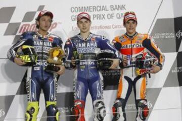 GP de Qatar 3º Bajo los focos del Circuito de Losail, el piloto de Cervera debutó en el Mundial de MotoGP con un brillante podio. Márquez terminó su primera carrera en la categoría reina en tercera posición, tras un intenso duelo con el pluricampeón del Mundo Valentino Rossi. Se convirtió en el piloto más joven —20 años y 49 días— en subir al podio en la era MotoGP.