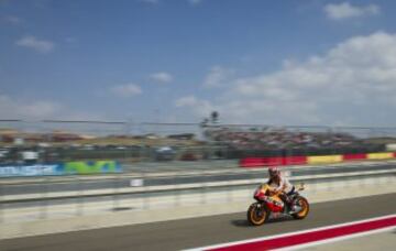 GRA310. ALCAÑIZ (TERUEL), 27/09/2014.- El piloto español de Moto GP, Marc Márquez, durante los entrenamientos libres llevados a cabo hoy, previos al Gran Premio de Aragón que se disputa mañana en el circuito Motorland de Alcañiz (Teruel). EFE/Javier Cebollada