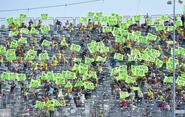 Los tifossi, respetando las medidas del protocolo por la Covid19, animan a su ídolo, Valentino Rossi.