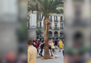 Aficionados del Newcastle la lían con una palmera en el centro de Barcelona: la secuencia es cómica
